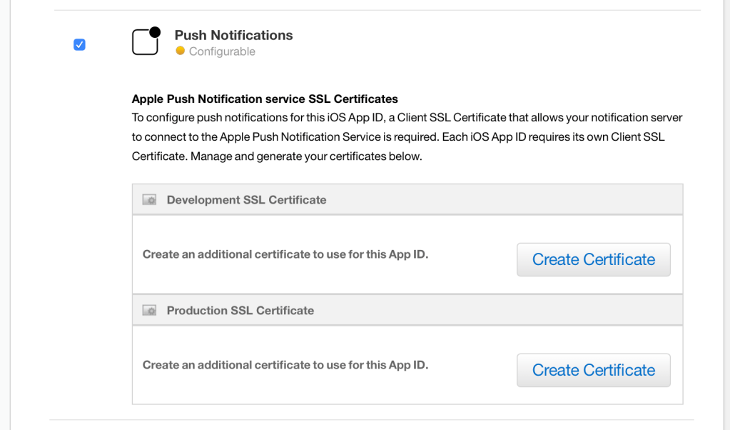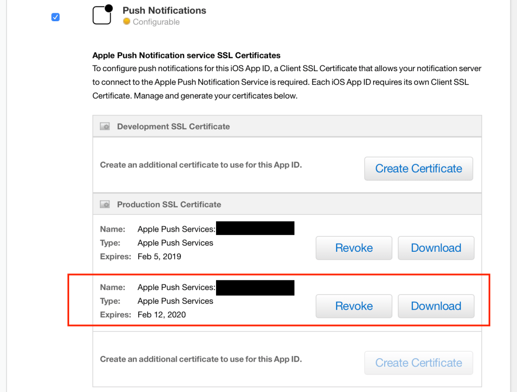 To verify the certificate’s Type and Expiration Date, navigate back to the AppID and click Edit, scroll to Push Notifications and view the certificate applied.