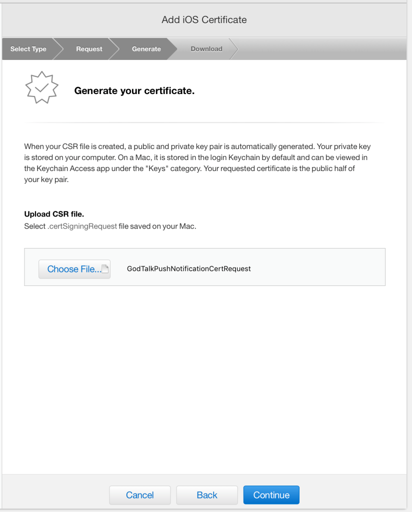 Click Create Certificate and click Continue to proceed to Step 2, Generate Certificate.