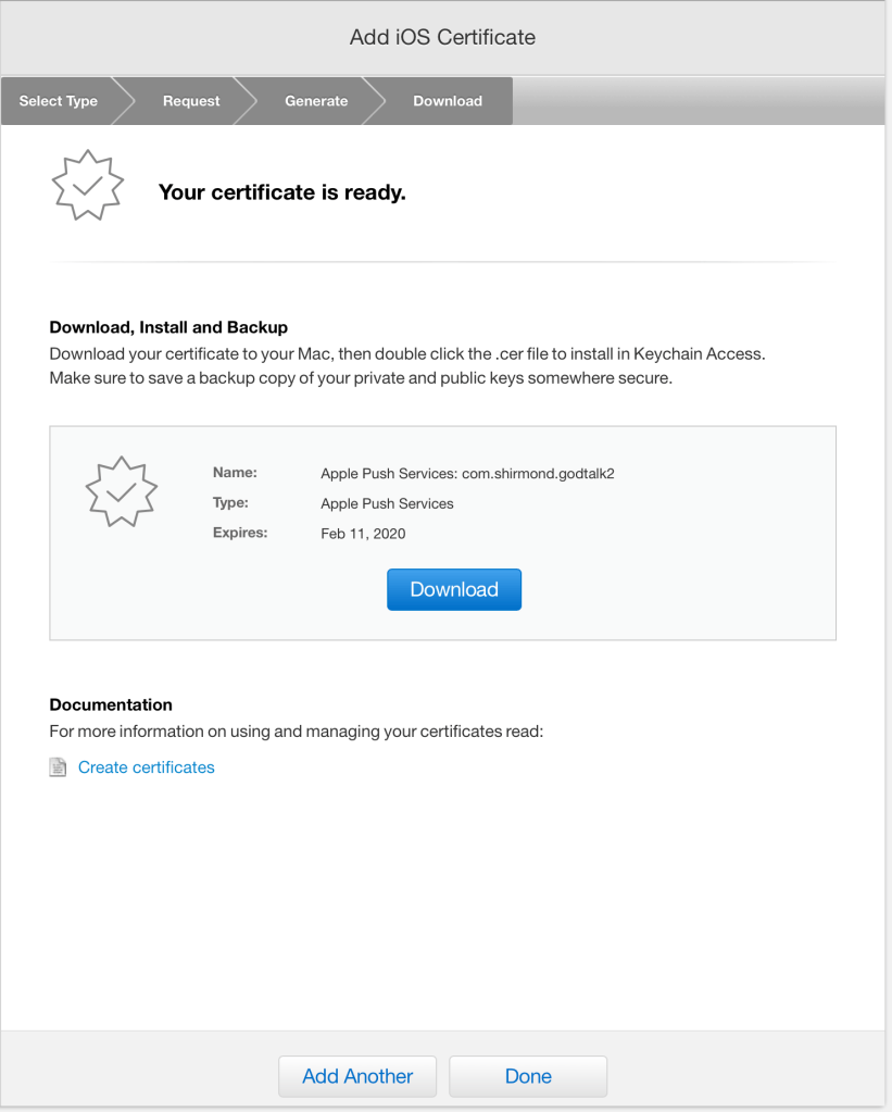 The certificate I have in place for GodTalk is expiring soon, so I needed to create a new one.