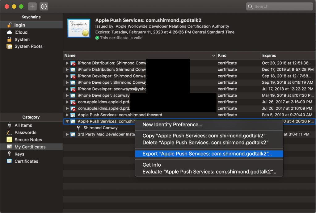 - Right-click on the new certificate, select Export Apple Push Services…